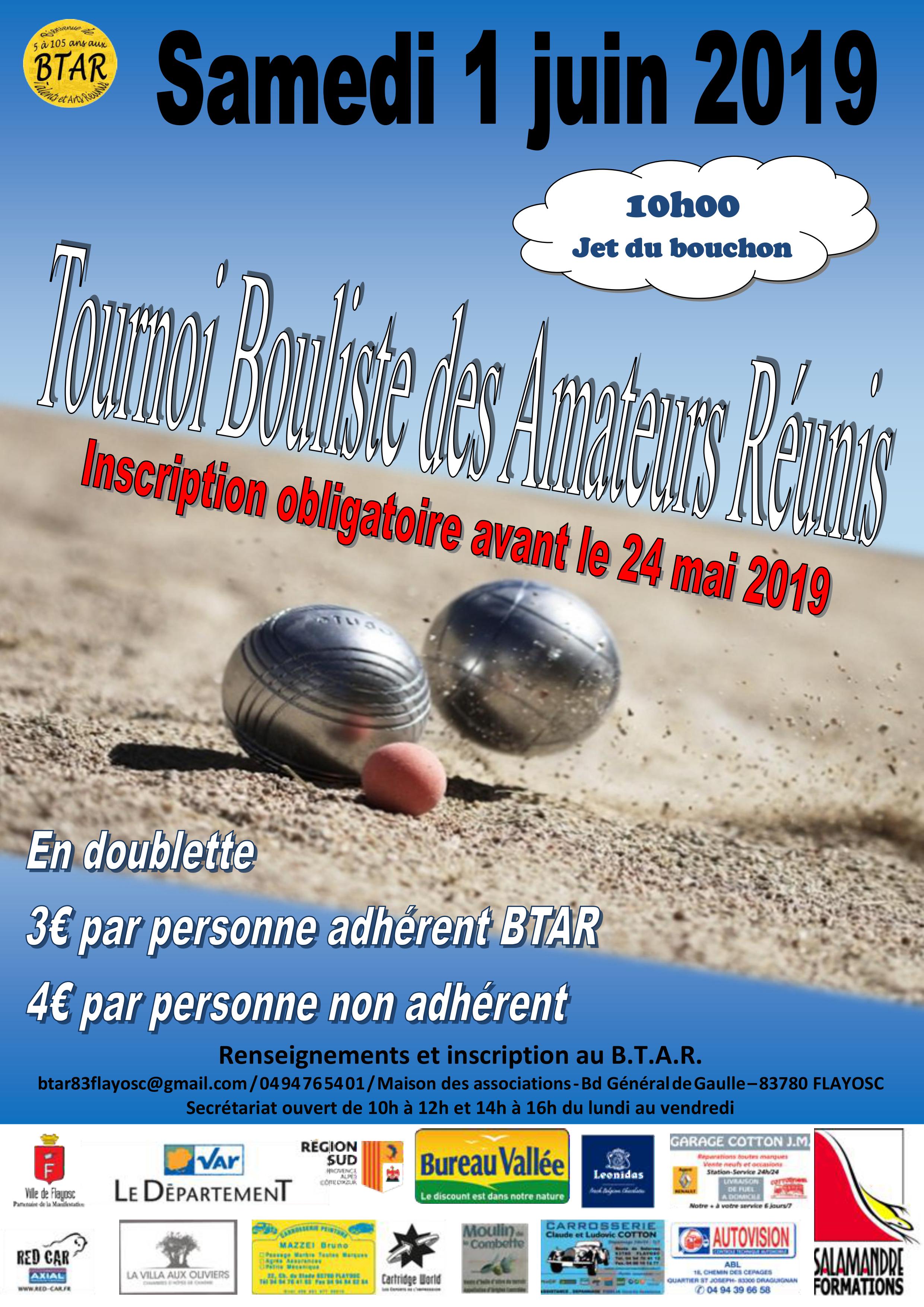 Tournoi de pétanque 28 mai 2019/dans agenda /par mflayoscLe BTAR organise un tournoi de pétanque le samedi 1er juin à partir de 10h00 sur la Place du 8 mai 1945.