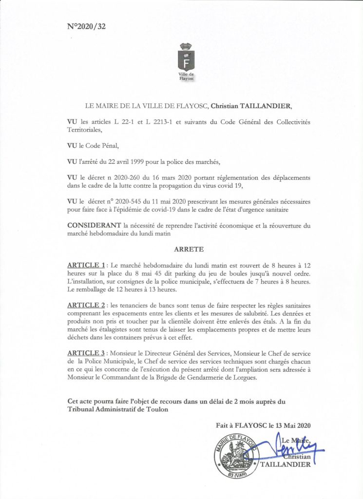 Avec l’ensemble des marchands habituels, le marché du LUNDI MATIN se tiendra exclusivement sur la Place du 8 mai 1945 dite place du jeu de boules, conformément aux directives sanitaires en vigueur actuellement et afin notamment de respecter les mesures de distanciation physique imposées par les consignes préfectorales ainsi que les espaces entre les chalands et le sens de circulation piétonne.