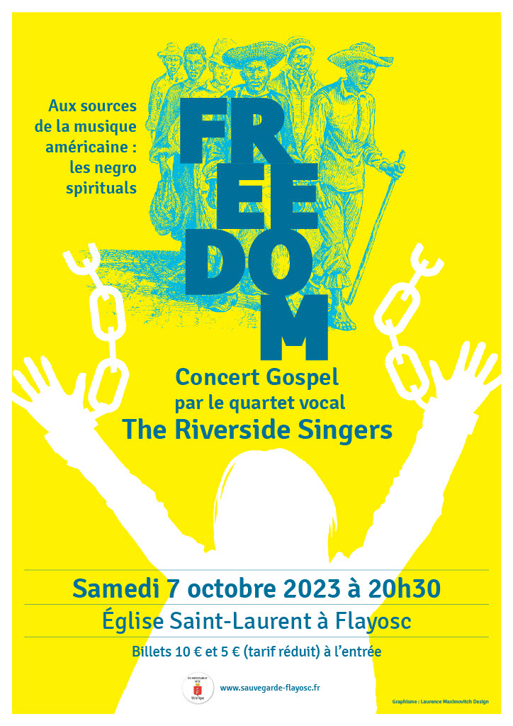 Après le succès du concert gospel Freedom en octobre dernier, l’association Sauvegarde de l’église Saint Laurent de Flayosc a invité le groupe grenoblois The Riverside Singers (4 chanteurs, basse, baryton, 2 ténors et leur pianiste) pour un nouveau concert Freedom, consacré cette année aux negro spirituals. Ces chants, d’une grande richesse poétique et mélodique, expriment la détresse et la soif de liberté des noirs-américains. aux temps sombres de l’esclavage et ont retenti dans les champs et les églises noires bien avant les gospels. Eglise de Flayosc, Samedi 7 octobre à 20h30, entrée 10 euros sur place (5 euros tarif réduit).