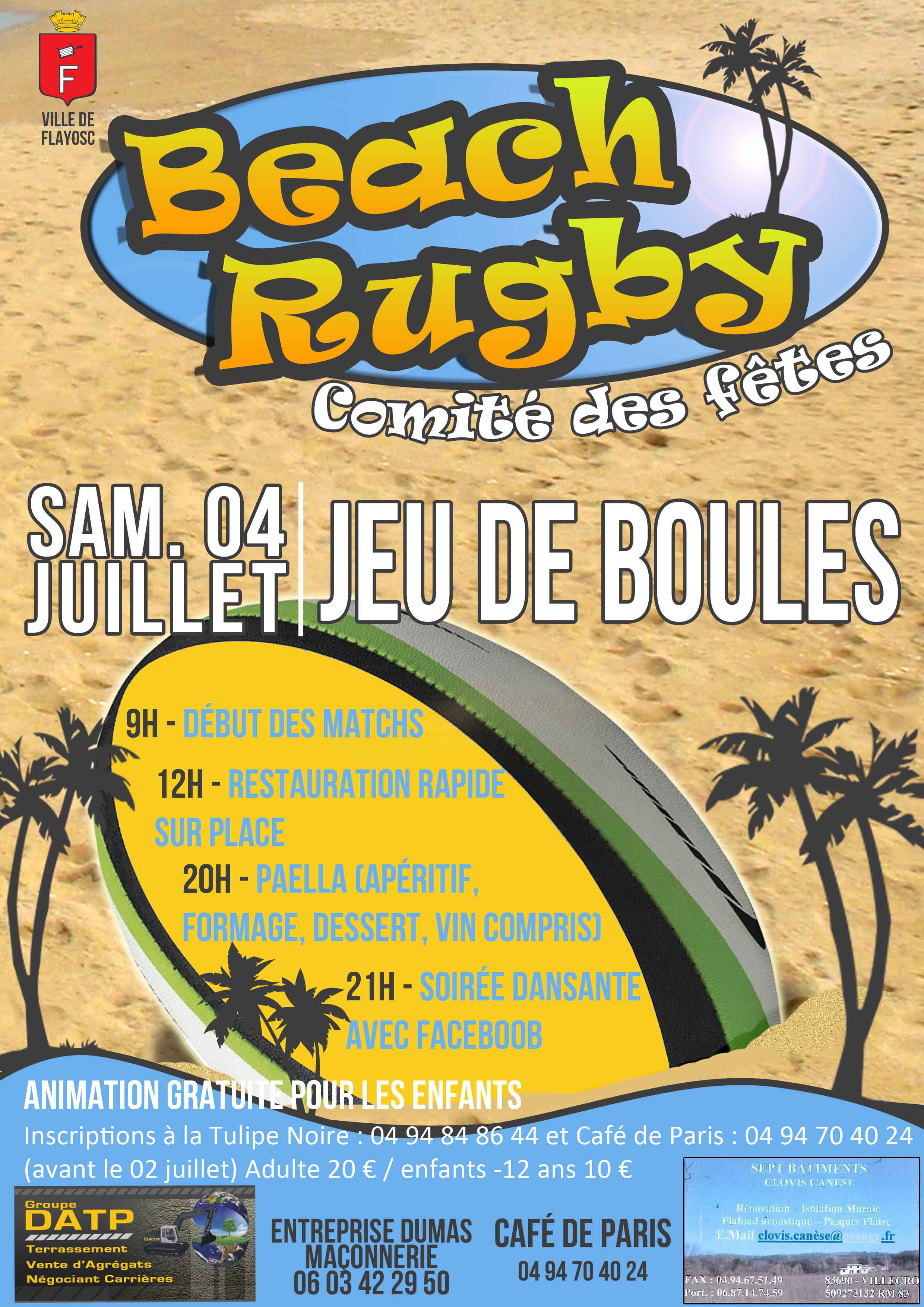 Le comité des fêtes de Flayosc organise un tournoi de Beach Rugby, samedi 4 juillet 2015 au jeu de boules de 9h00 à 21h00.